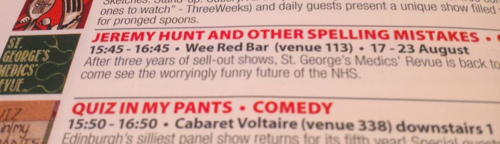 “Unboring. That’s the word you’ll find splashed over the front cover of this year’s Edinburgh Fringe programme … It’s not actually a word at all, of course. You’ll find it in the Urban Dictionary – ‘a word used by people with no vocabulary’ … Unboring is unsightly, ungrammatical and uninspiring; utterly unworthy of the Edinburgh Fringe.” (Matt Trueman, The Stage, June 26th 2014)